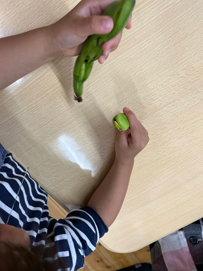 2歳児さんそら豆を剥いて給食のお手伝いです。